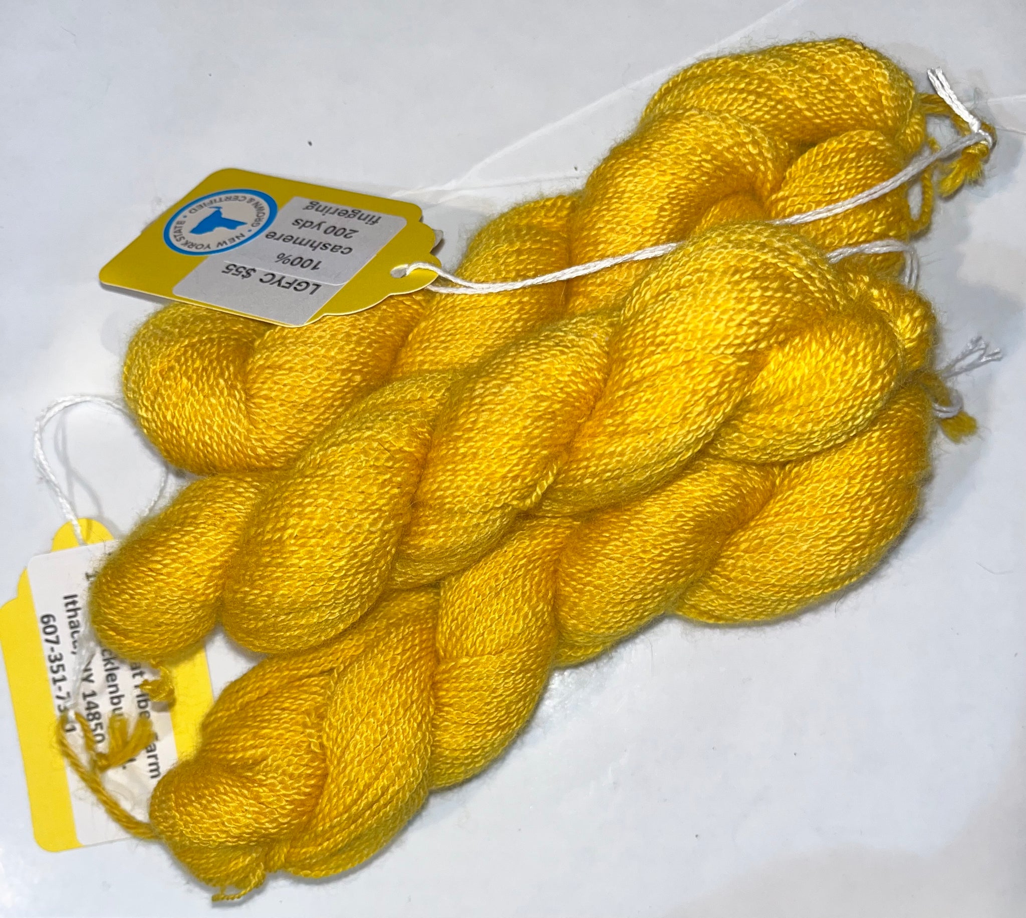 1 ounce skeins of pure cashmere from our very own Cashmere Goats. There is simply nothing like it. It's so soft it feels like a cloud. In natural ivory and taupe colors.